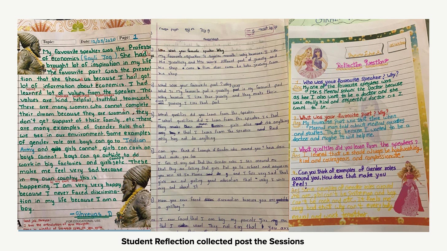 Once our sessions were done, it was important to help the class synthesize their understanding. I gave them a few personal response reflection questions, to encourage them to think and articulate their learnings. I was amazed as I read their submissions – every student had perceived each session in a very different way. Students who generally took little interest in writing and expressing themselves had taken a lot of effort to submit their work. A lot of responses also spoke about how a certain speaker had inspired them to pursue a similar career. Most importantly, however, my students realised the importance of making opportunities available to every person, irrespective of their gender. Understanding the lives of these four speakers helped them visualize the idea of empowerment and how it might look like in real life. We also tried to collectively build an understanding of the importance of gender equality for everyone through classroom discussions and learning circles. We explored the idea of gender roles and how they set us all up with unfair, discriminatory expectations. Several students shared their experiences of gender roles and prejudices. Boys spoke at length about not being allowed to express themselves creatively while girls spoke about the unreasonable expectations put on them.